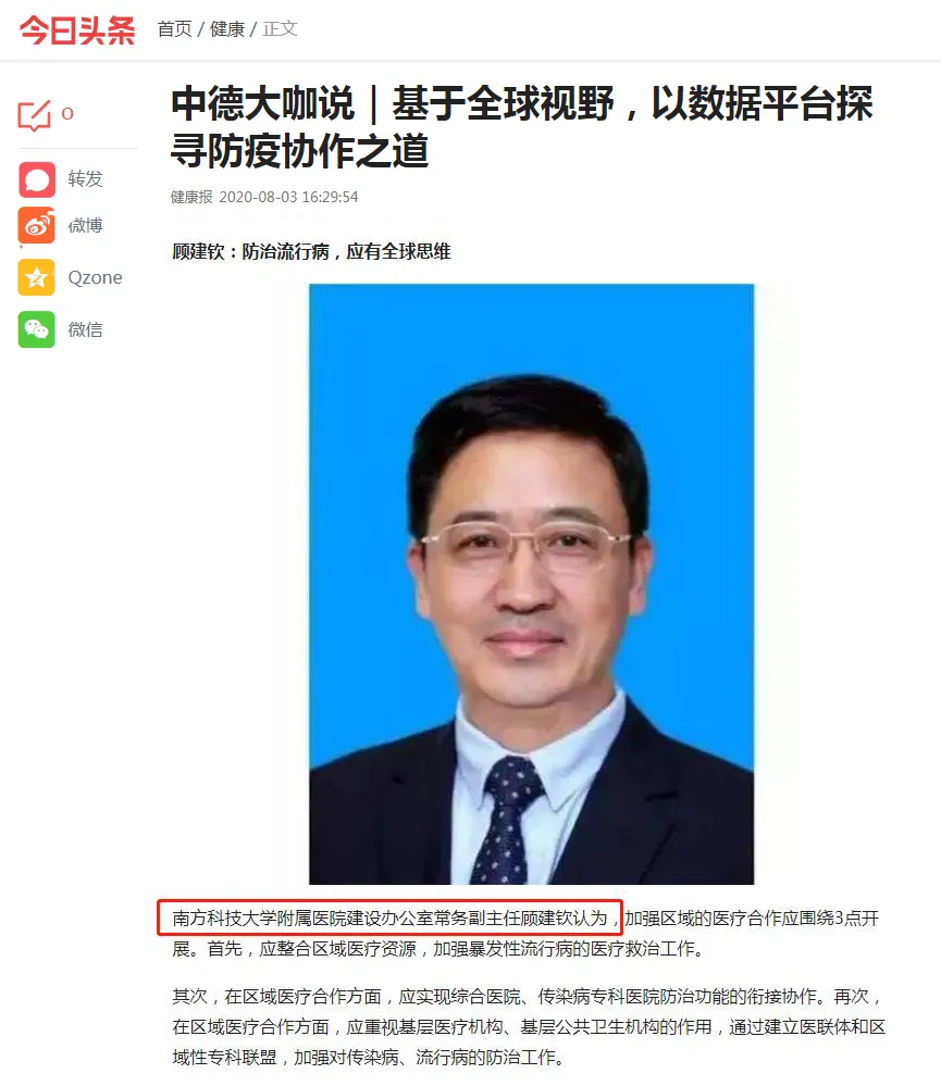 近日,《健康报》在今日头条官方账号上发布的两条消息,让传言终于落地了。从《健康报》的报道看,顾建钦已出任南方科技大学附属医院建设办公室常务副主任。