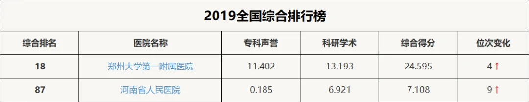 河南省人民医院排名第87位,比2018年上升9个位次。复旦榜发布已经11年了。在榜单发布的第3年(2011年),河南实现0的突破,郑州大学一附院跻身榜单,排名第100位。随后,郑大一附院的位次逐步上升。2016年,郑大一附院不再孤单,河南省人民医院也进入百强榜单,排名第97位。 也就是从2016年开始,连续4年,河南入围复旦榜单的,始终是郑大一附院和河南人民医院。做任何事儿,都要有计划,定个目标,比如有的人的小目标是“先挣1个亿”。今年1月,郑大一附院召开了2019年度总结表彰暨2020年工作动员大会。会上,院长刘章锁强调:要全面提升医疗、教学、科研和管理水平,早日实现进入国内医院第一方阵的发展目标。此后,郑大一附院在多次消息和活动中,提到进军全国“全国第一方阵”。今年5月,河南省慢性肾脏疾病精准诊疗重点实验室、河南省磁共振功能成像与分子影像重点实验室落户郑大一附院。该院官网称,实验室的落户,必将为医院早日迈入全国医院第一方阵提供有力支撑。还是今年5月,郑大一附院外一党总支、外科医学部在河医院区、郑东院区麻醉科示教室召开“外一党总支外科医学部高值医用耗材治理工作会”,会上,对怎样实现刘章锁院长提出的医院“进入第一方阵”目标进行了讨论。不过,“第一方阵”不是具体的名次,概念相对模糊,每个医院,每个人的理解都不一样。正如1000个人心中,有1000个“哈姆雷特”。