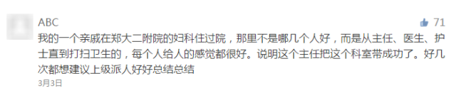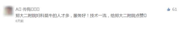 网友A传梅:郑大二附院的妇科挺牛的,人才多、服务好、技术一流!给郑大二附院点赞。